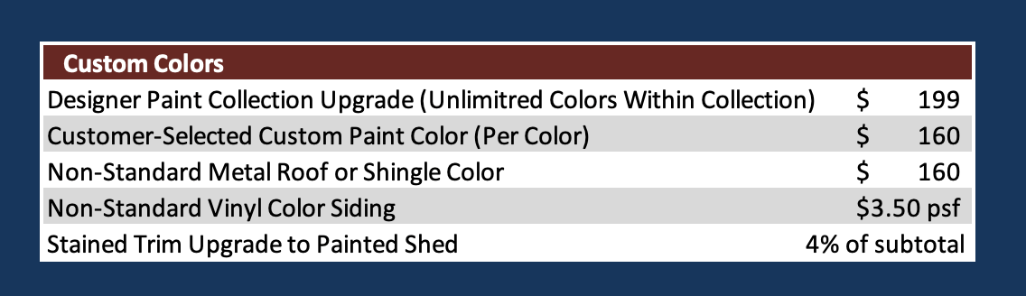 Of course, if you have your own custom colors in mind, , we can make that happen for a small fee of $160 charge for each custom paint color.