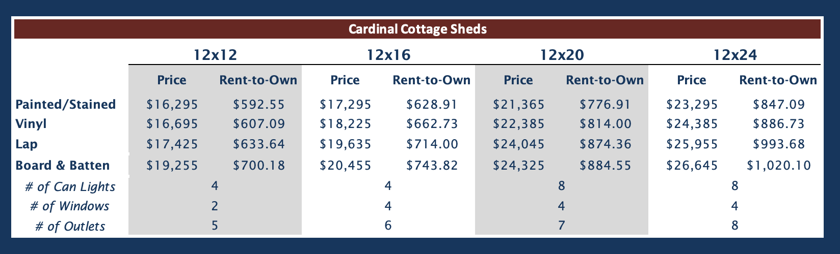 The Cardinal Cottage Shed is available all siding types and in four sizes: 12x12, 12x16, 12x20, and 12x24.