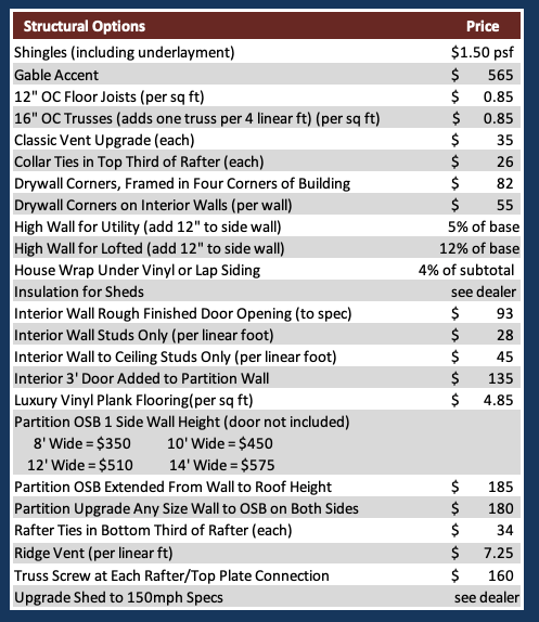 Add 5% of base price for utility sheds.