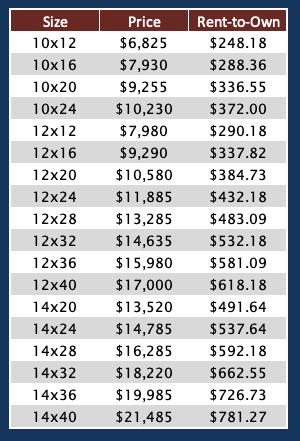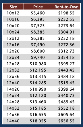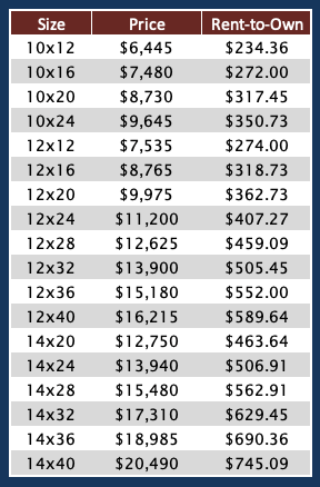 Please note that 8’, 10’ and 14’ wide sheds are measured wall to wall, while 12’ wide sheds are measured across eaves due to NC DOT regulations.