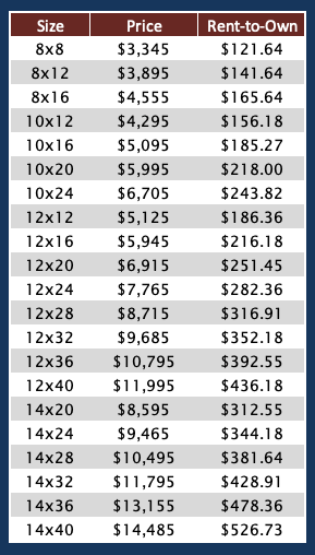 Please note that 8’, 10’ and 14’ wide sheds are measured wall to wall, while 12’ wide sheds are measured across eaves due to NC DOT regulations.